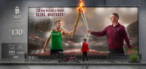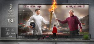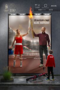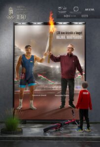 A plakátokon a már visszavonult olimpiai bajnok meggyújtja a jelen bajnokának fáklyáját a szurkolókkal zsúfolásig megtelt stadionban, amit a „jövő bajnoka” áhítattal figyel. Ebben a képben benne van minden, ami a magyar sport. A múlt tisztelete, a jelen megbecsülése és a jövő fontosságának hangsúlyozása.